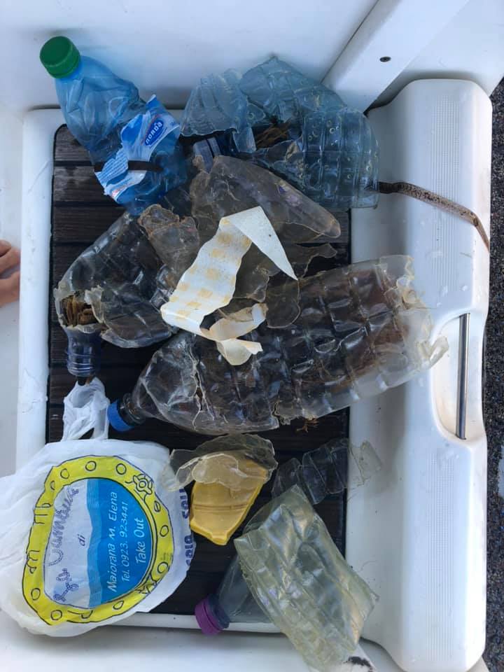 Molto attivo anche Pietro Fiamingo, che ci manda le foto delle sue catture sia dall’Isola d’Elba, Marciana Marina (foto a sinistra: “Pieno di plastica …. raccolto per quel che potevamo in barca”) che da Favignana, isole Egadi (Sicilia).